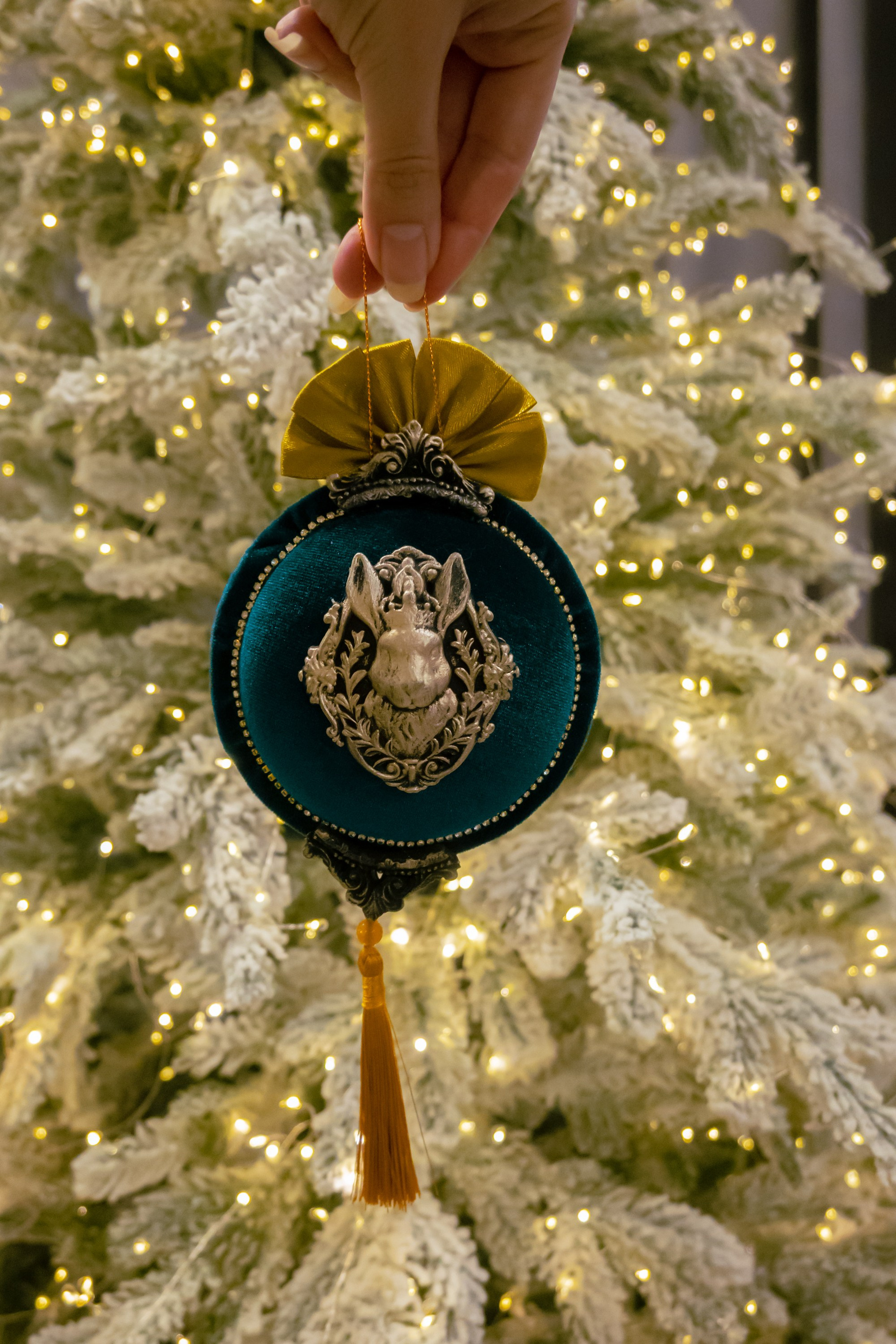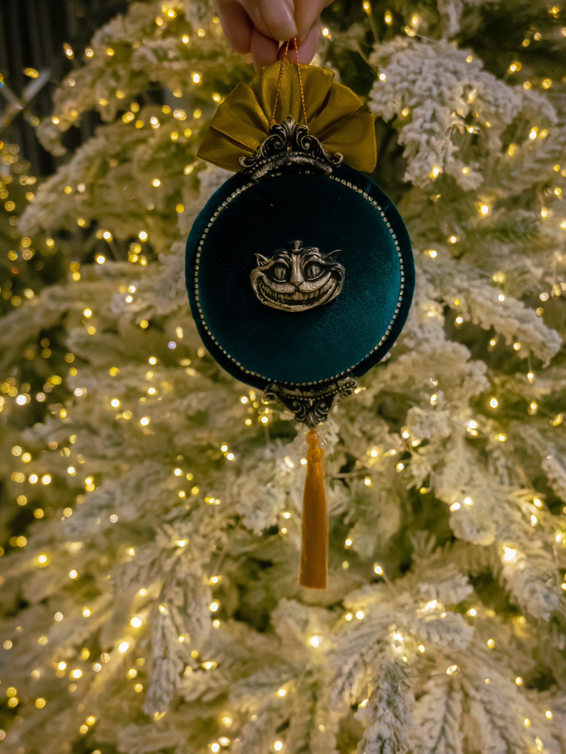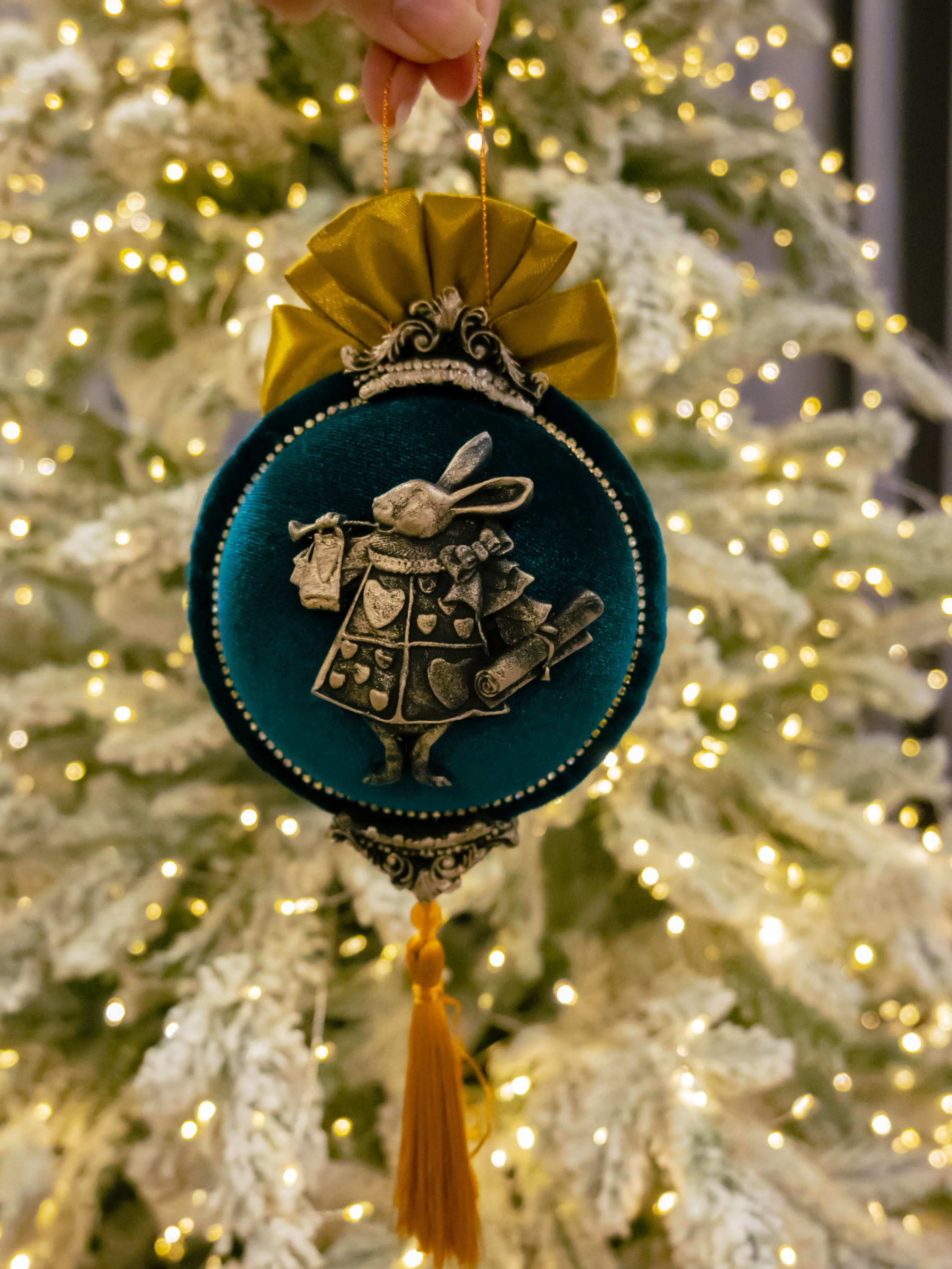Все игрушки обтянуты зеленым бархатом изумрудного оттенка. На шарах присутствует лепнина, стразы, искуственные цветы. Шар 8 см и шар 10 см. В медальонах на лицевой стороне расположена апликация, украшеная стразами, кисточкой снизу. Снизу, сверху и с обратной стороны есть лепнина. Верхушку дополняет ажурный атласный бант. Все элементы лепнины обработаны поталью. Данная серия представлена набором- поштучно не продается. В подарок идут наклейки на тематику «Алиса в стране чудес».