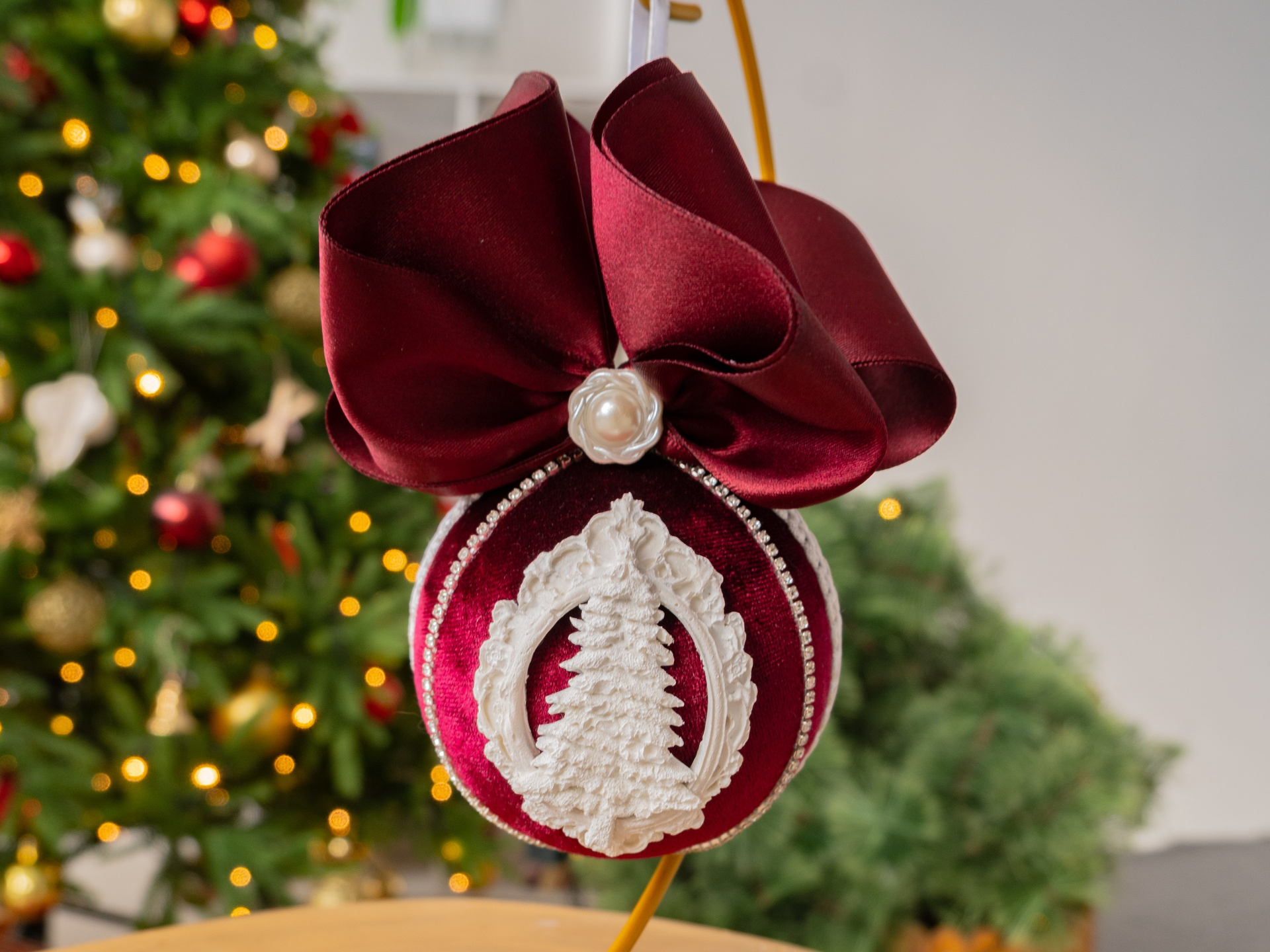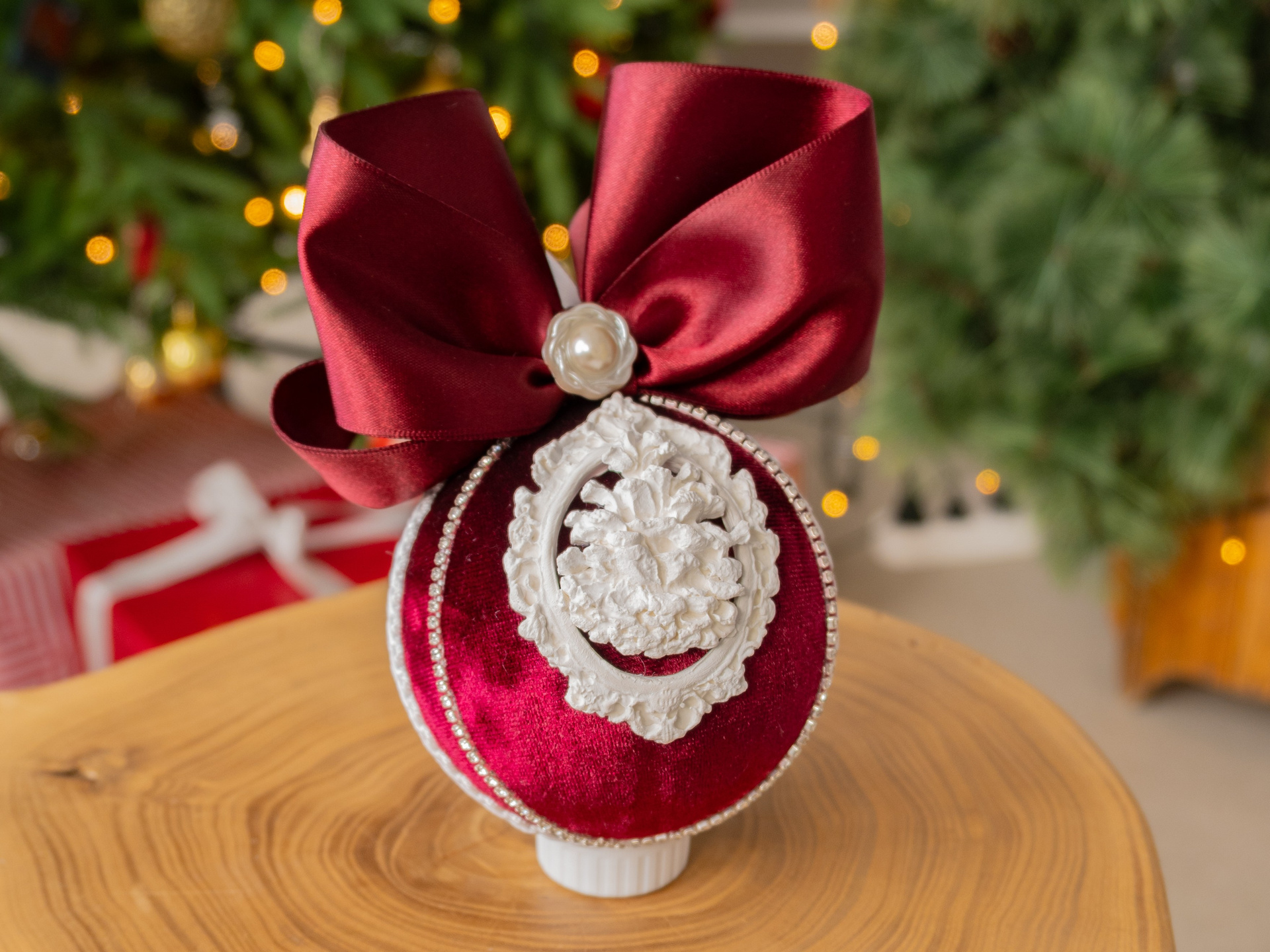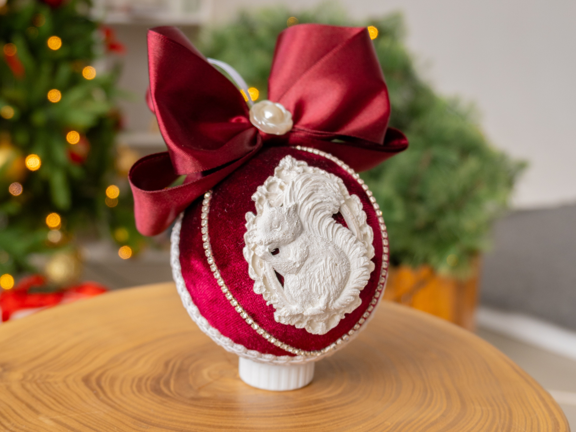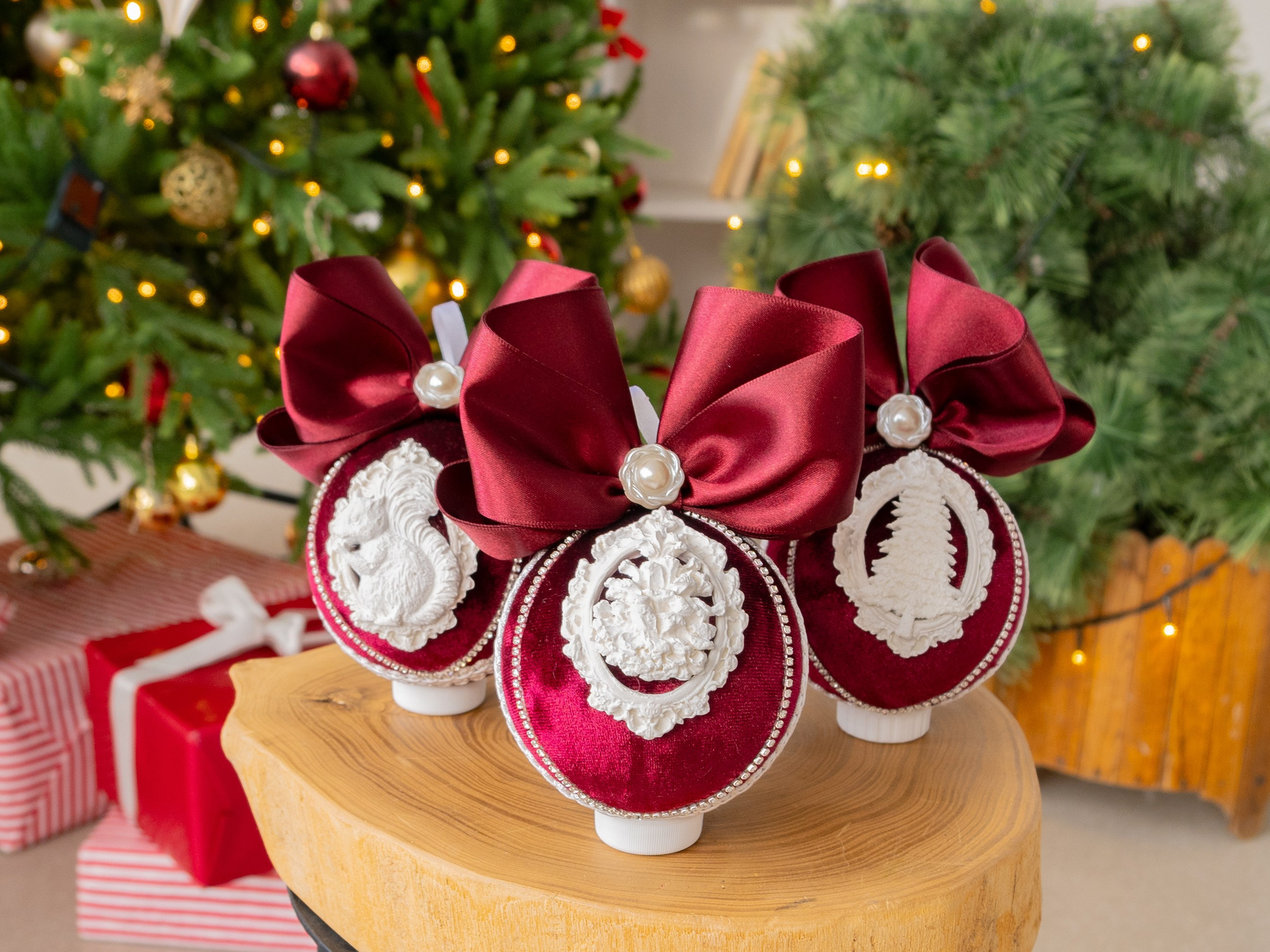 Роскошный набор из 3х шаров: лепнина (елочка, белка и шишка), стразовая цепочка и объемный бант с кабошоном.